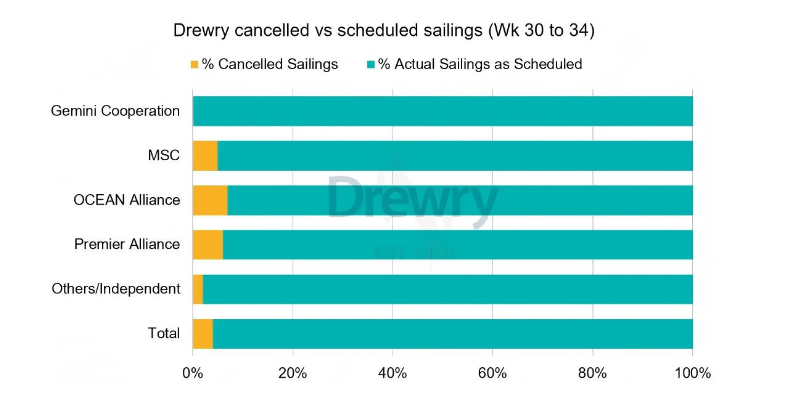 運力調整方面,盡管主要東西向航線的停航數量正在減少,7月環比下降56%,8月再降8%,但整體運力水平仍處于高位。數據顯示,在第30周至第34周(7月21日至8月24日期間)這五周內,跨太平洋、跨大西洋以及亞洲-北歐及地中海三大航線共計716個航次中,預計將有29個航次被取消,取消率為4%。其中,停航主要集中在跨太平洋東行航線(占比66%),其次是亞洲-北歐及地中海航線(21%)和跨大西洋西行航線(13%)。與此同時,未取消航次的比例正在提升,預計96%的航次將按計劃開航。
