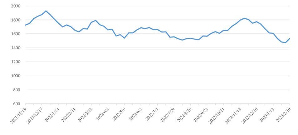 內貿集運指數企穩上揚,本期(2023年2月04日至2月10日)中國內貿集裝箱運價指數(XH·PDCI)報1535點,較上期內貿集裝箱運價指數環比上漲58點,漲幅3.93%,同比下跌117點,跌幅7.08%。其中華南、華北、華東、東北、山東區域指數上漲,福建區域指數下跌;四條流向指數全面上漲。6個區域子指數“5漲1跌”,4個流向子指數全面上漲。