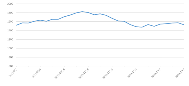 華北區域:區域內環保限制解除,鋼廠恢復產能保持平穩,但受貿易價格回落影響,產能恢復緩慢;PVC貨源貿易低迷,工廠開工率下調,市場出運量處于低位。本期華北指數報收1381點,環比下降90點,降幅6.12%,其中華北至華南指數報收1422點,環比下降101點,降幅6.63%。