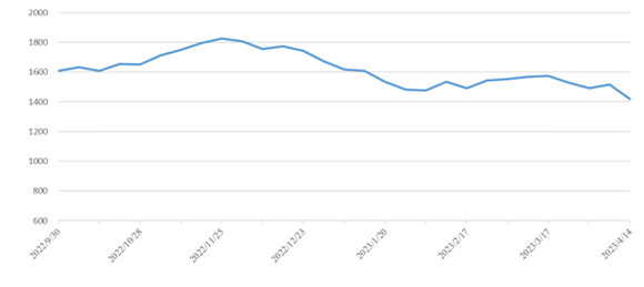 市場需求較淡運量處于較低水平,本期(2023年4月08日至4月14日)中國內貿集裝箱運價指數較上期震動下跌。
