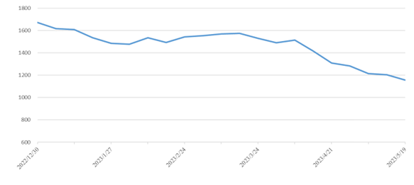 華南區域:受房地產行情震蕩影響,陶瓷需求恢復不及預期開窯率在50%左右,導致出運量仍然處于低位。本期華南指數報收1546點,環比下跌7點,跌幅0.45%,其中華南至東北指數報收1059點,環比下跌37點,跌幅3.38%,華南至華北指數報收1429點,環比下跌20點,跌幅1.38%。
